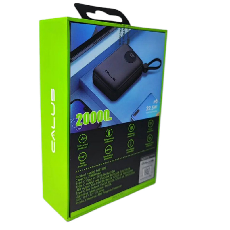 پاور بانک کالوس ۲۰۰۰۰ مدل fast 209 سوپر فست شارژ یکی از گزینه های قدرتمند و در عین حال خوش دست در بازار لوازم جانبی است. این دستگاه با تمرکز بر تکنولوژی Super Fast Charge طراحی شده تا نیاز کاربران حرفه ای که همزمان چندین دستگاه دارند را برطرف کند. پاوربانک CALUS FAST۲۰۹ یک پاوربانک جمع وجور و قدرتمند است که با پشتیبانی از شارژ سریع ۲۲.۵ وات گزینه ای عالی برای استفاده روزمره سفر و محل کار محسوب میشود. وجود کابل داخلی و نمایشگر دیجیتال استفاده از این پاوربانک را بسیار راحت و کاربردی کرده است.خروجی USB تکنولوژی QC و Super Fast) نکته برجسته این پورت خروجی 10v/2.25a است. این مشخصه نشان دهنده پشتیبانی از توان ۲۲.۵ وات است. خروجی Type-C تکنولوژی (PD بیشترین توان را در ولتاژ 9v/2.22a حدود ۲۰ وات ارائه میدهد که برای شارژ سریع سری آیفون ۱۲ تا ۱۵ کاملاً بهینه است.لایتنینگ (Lightning ورودی 5v/2a مخصوص کاربران آیفون تعبیه شده تا نیاز به حمل کابل اضافه برای شارژ پاوربانک نداشته باشند.تایپ سی Type-C) از توانهای مختلف تا ۱۸ وات (9v/2a) پشتیبانی میکند که باعث میشود خود مخزن ۲۰۰۰۰ میلی آمپری در زمان معقولی شارژ شود.این پاوربانک در دسته محصولات Compact یا فشرده قرار میگیرد.