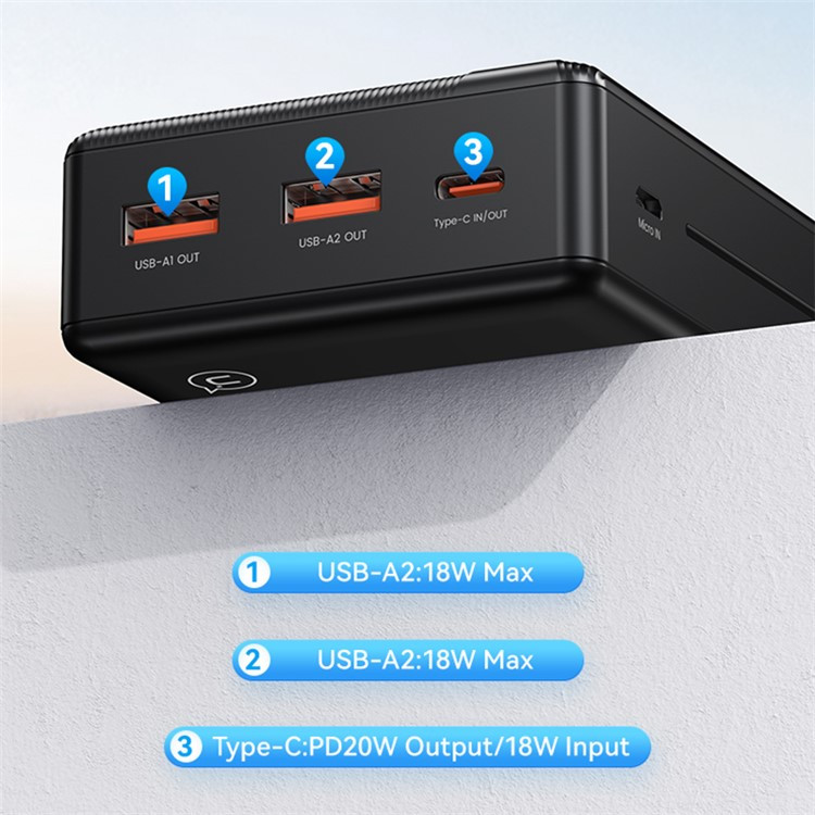 دو درگاه خروجی USB-A با مشخصات 5V/3A 9V/2A 12V/1.5A و یک درگاه خروجی Type-C با مشخصات 5V/3A 9V/2.22A 12V/1.67A .