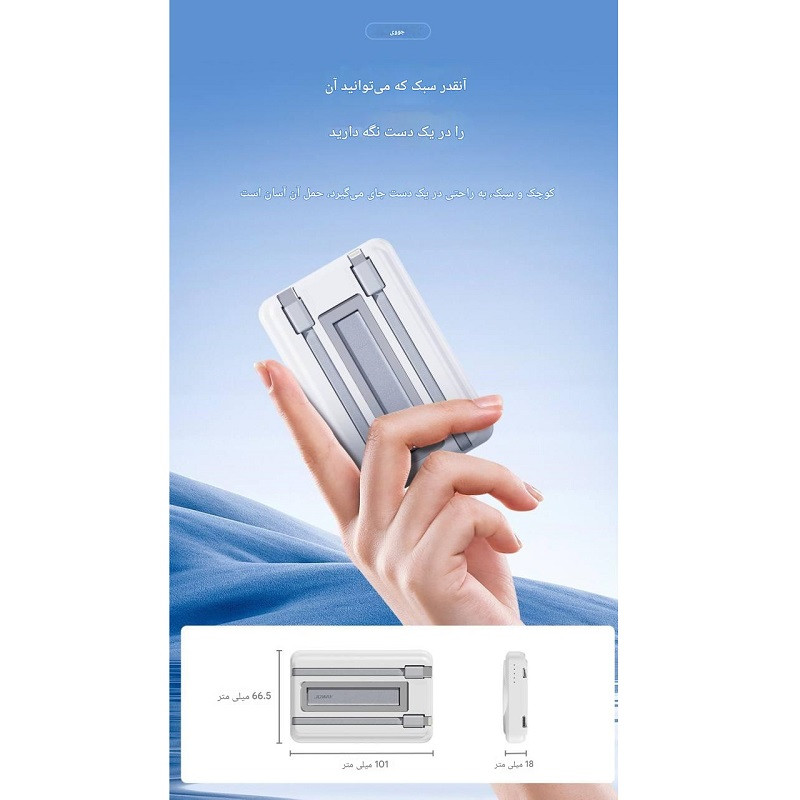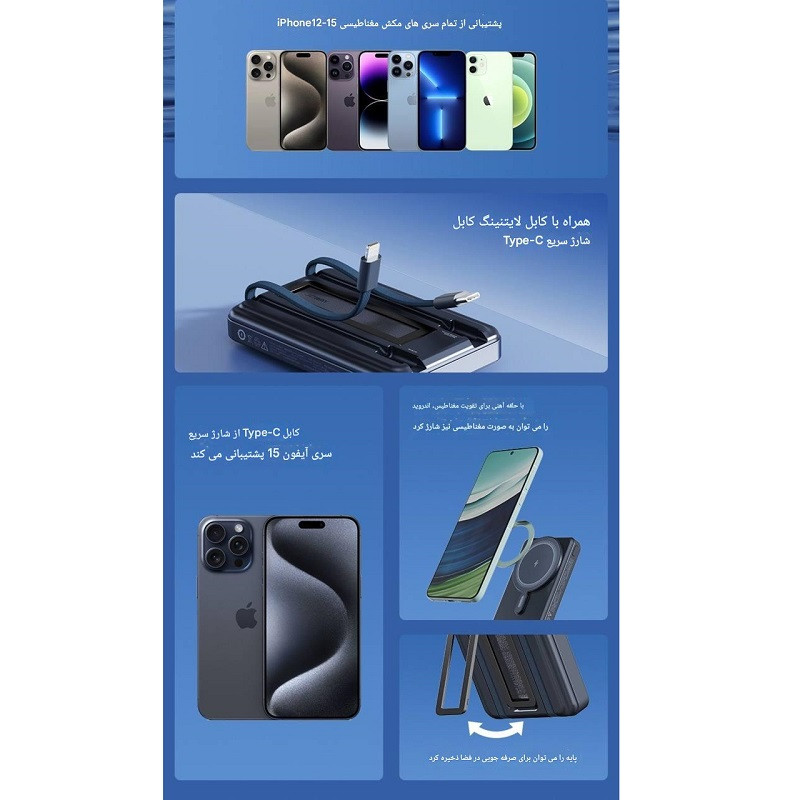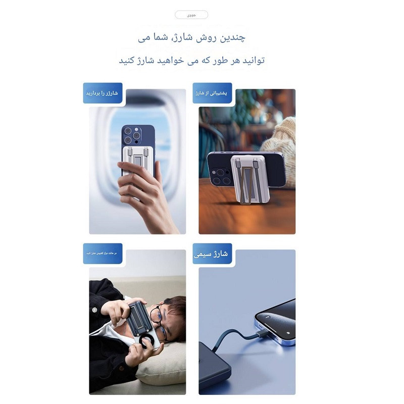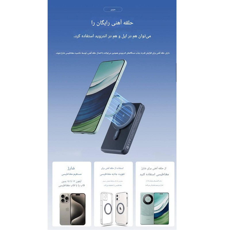 مشخصات فنی: *ظرفیت: 10000 میلیآمپر ساعت *اتصال: مغناطیسی و با سیم *پورتها: USB-C، USB-A *شارژ سریع * نمایشگر LED * طراحی جمع و جور *موجود در دو رنگ سفید و مشکی