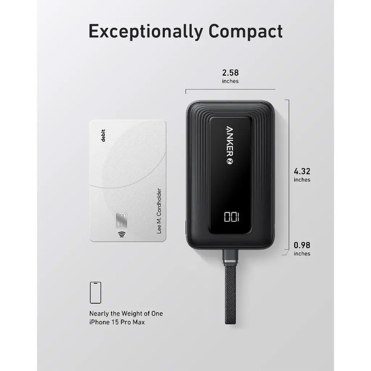 خروجی: تا 30 وات (شارژ سریع USB-C) / ورودی: 20 وات (شارژ سریع دوطرفه USB-C) / شارژ آیفون 15: از 0 تا 57 درصد در 30 دقیقه / حدوداً 2 بار شارژ کامل برای آیفون 15 / 1.94 بار شارژ برای سامسونگ S24 /