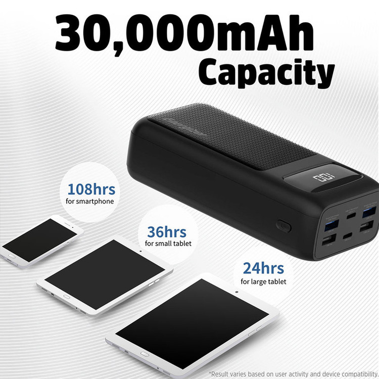 ظرفیت 30000 میلی آمپر ساعت توان خروجی 30 وات دارای درگاه خروجی USB و Type-C دارای درگاه مشترک ورودی و خروجی Type-C دارای نمایشگر LED استفاده از فناوری فست شارژ و پاور دلیوری