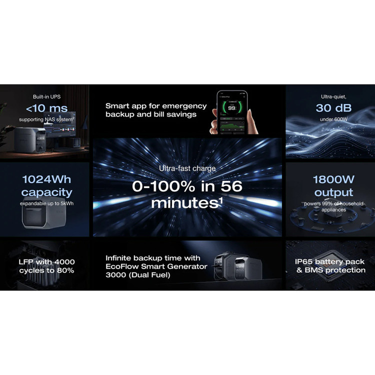 امکان شارژ سریع (0تا100 در 56 دقیقه) / رسیدن به عمر باتری 80 درصد در 4000 چرخه / باتری با استاندارد مقاومتی IP65(مقاوم در برابر آب) / دارای اپلیکیشن هوشمند برای کنترل پاوراستیشن / صدای بسیار کم 30 دسیبل