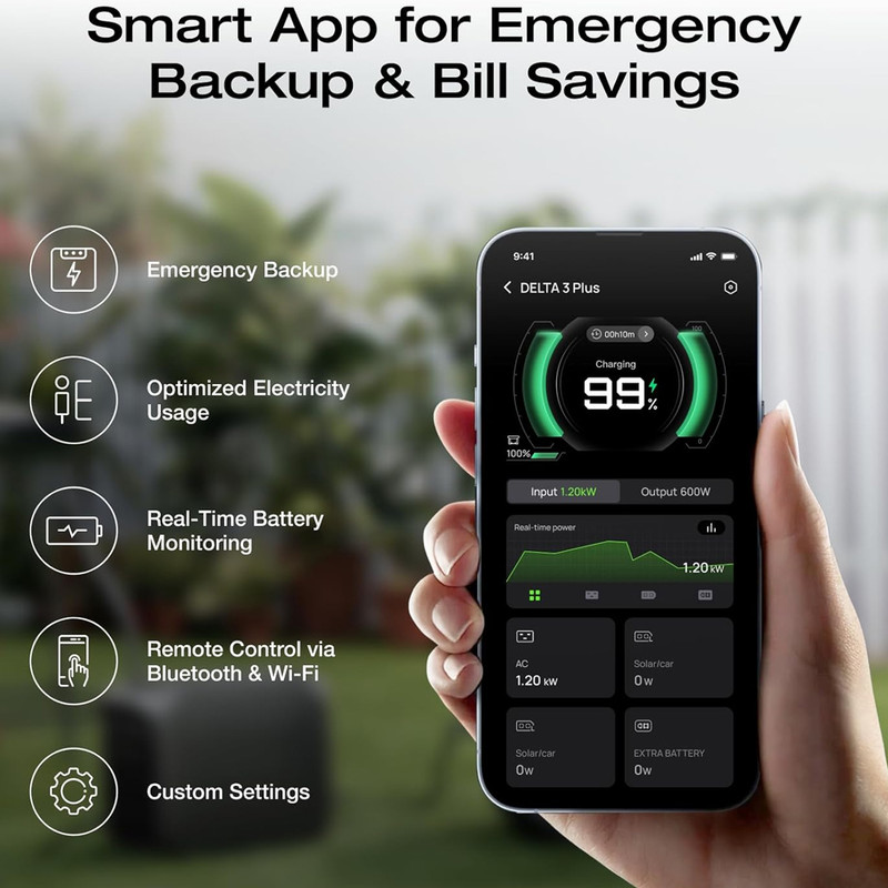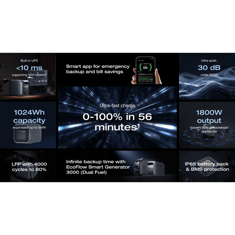 امکان شارژ سریع (0تا100 در 56 دقیقه) / رسیدن به عمر باتری 80 درصد در 4000 چرخه / باتری با استاندارد مقاومتی IP65(مقاوم در برابر آب) / دارای اپلیکیشن هوشمند برای کنترل پاوراستیشن / صدای بسیار کم 30 دسیبل