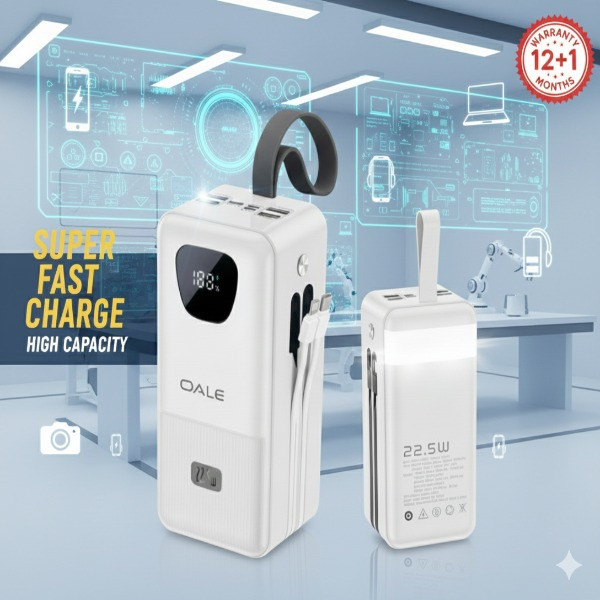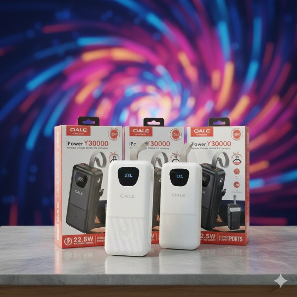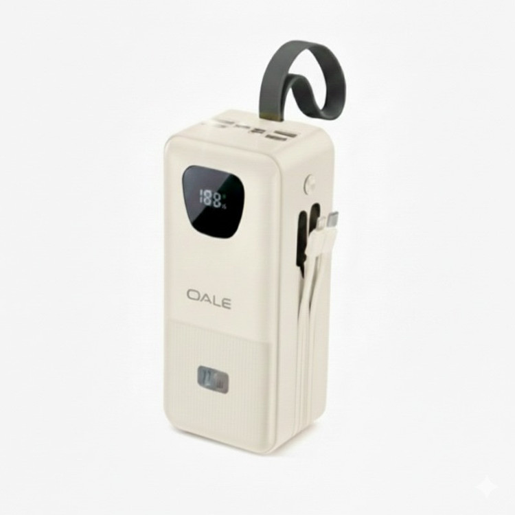 این پاوربانک 22.5 وات است که دارای 4 درگاه خروجی USB و درگاه تایپ سی دارد و دو کابل تایپ سی و آیفونی دارد و صفحه نمایش دیجیتالی دارد و یکی چراغ قوه پشت آن قرار دارد