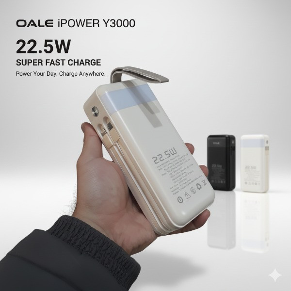 این پاوربانک 22.5 وات است که دارای 4 درگاه خروجی USB و درگاه تایپ سی دارد و دو کابل تایپ سی و آیفونی دارد و صفحه نمایش دیجیتالی دارد و یکی چراغ قوه پشت آن قرار دارد