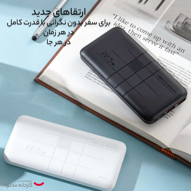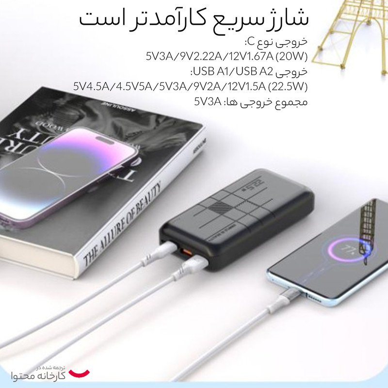ظرفیت 20000 میلی آمپر ساعت دو درگاه خروجی USB-A و یک درگاه USB-C پشتیبانی از فناوری های شارژ سریع QC3.0 و PD3.0 شارژ خودکار با شدت جریان 2.0 آمپر بدنه مقاوم در برابر ضربه و گرد و غبار