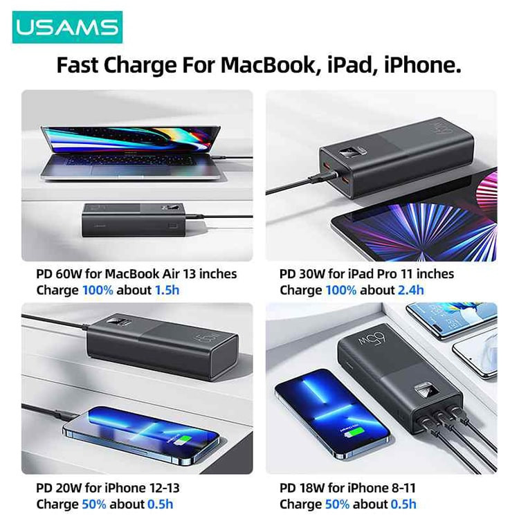 پشتیبانی از فناوری شارژ سریع QC و PD - قابلیت شارژ انوتع لپ تاپ و نوت بوک با خروجی 65 وات - دارای یک کابل همراه تایپ سی 100 وات