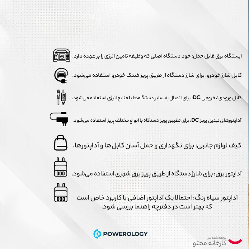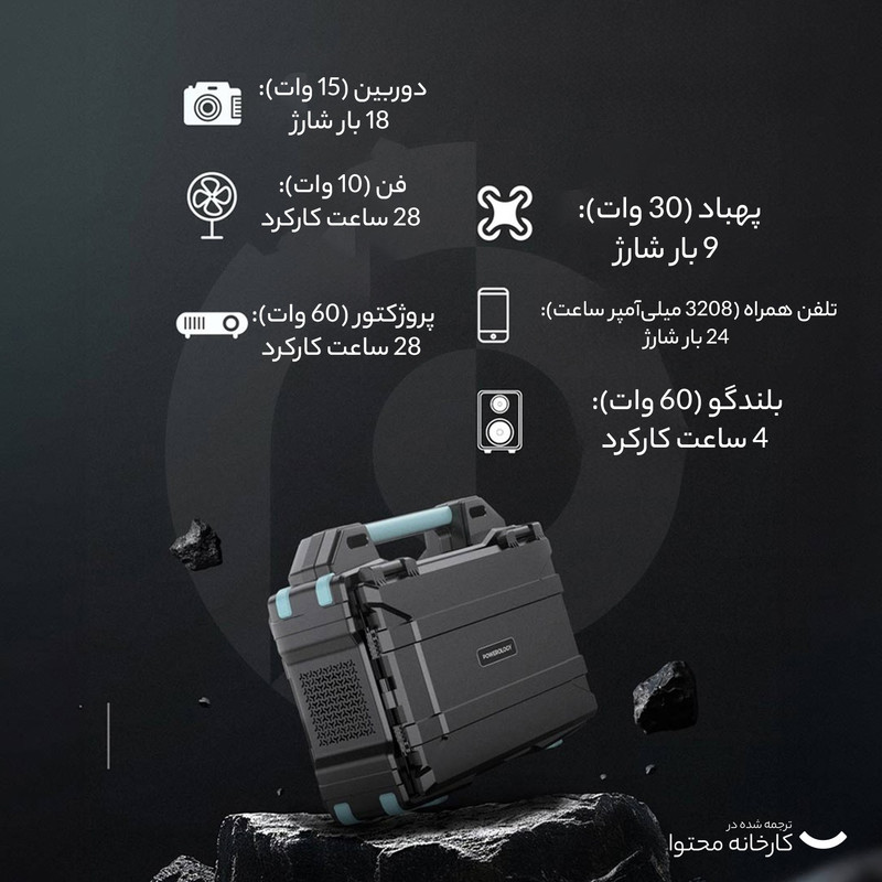 باتری لیتیوم-یونی ظرفیت 76800 میلیآمپر ساعت - 300 وات خروجی برق متناوب (AC): 300W/220V خروجی فندکی: 12V-16.8V/10A خروجی یواسبی-سی (Type-C) 5V/3A, 9V/3A, 12V/3A, 15V/3A, 20V/3A 60W خروجی 60W-PD