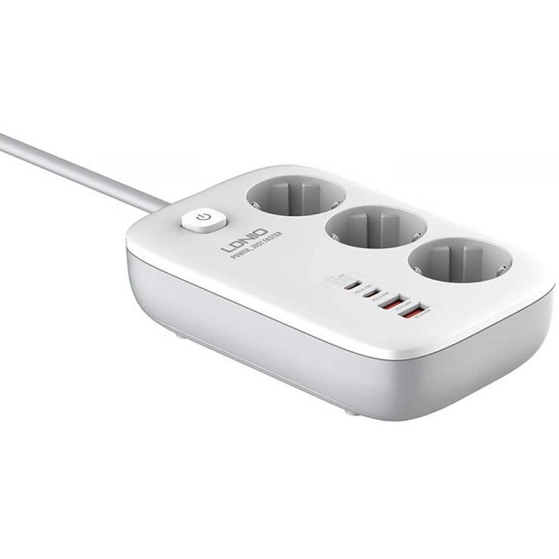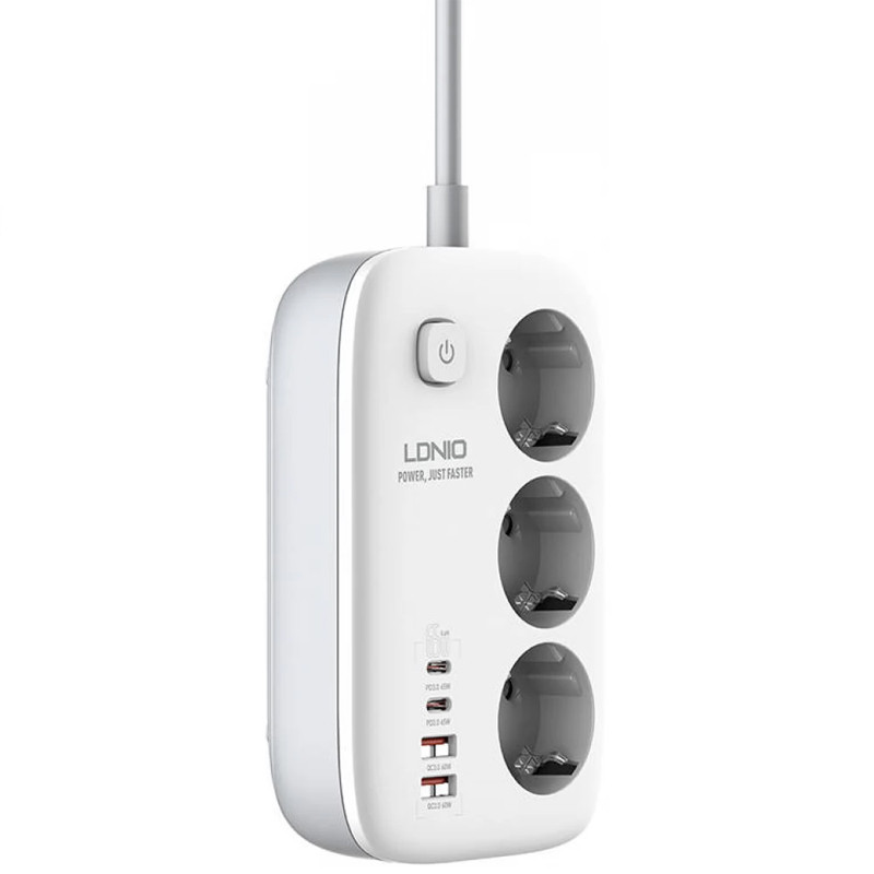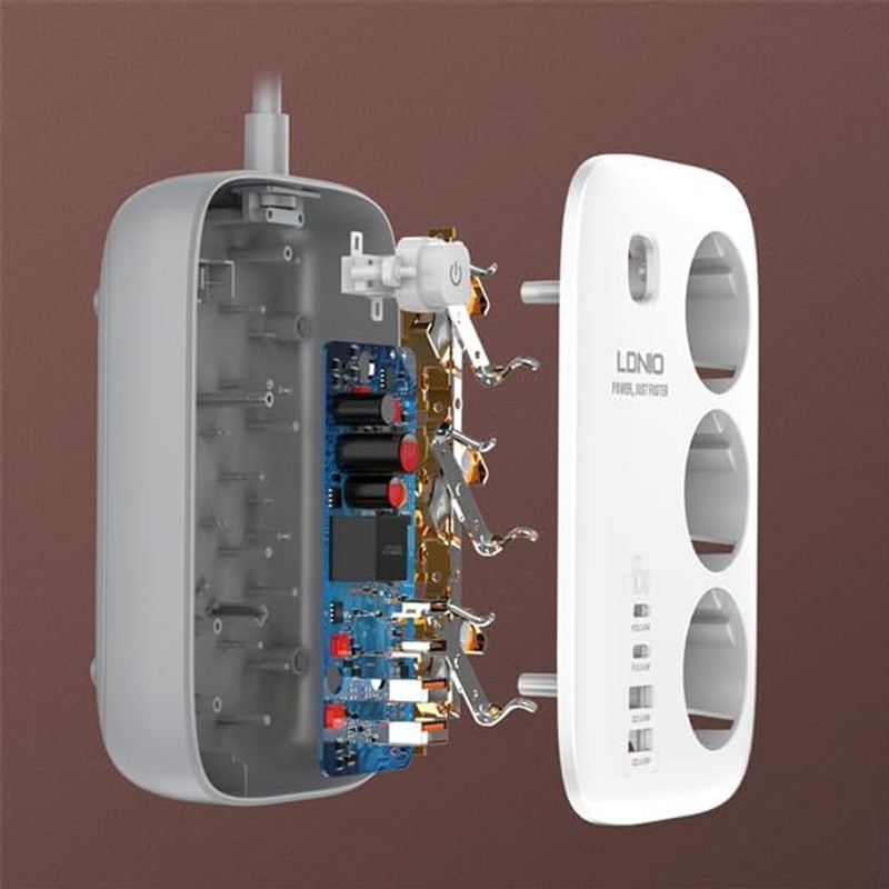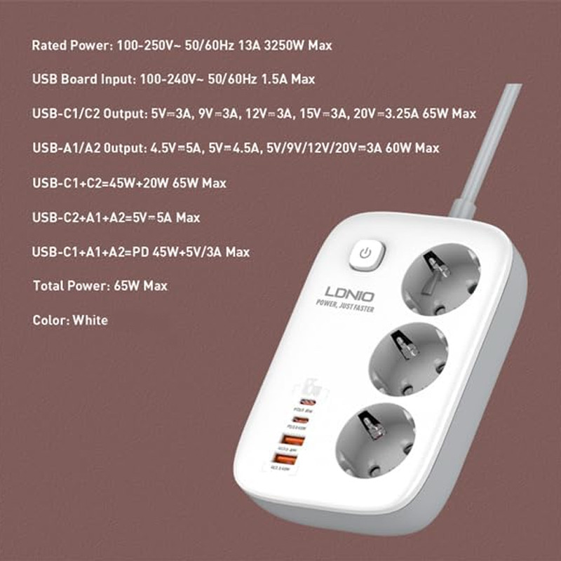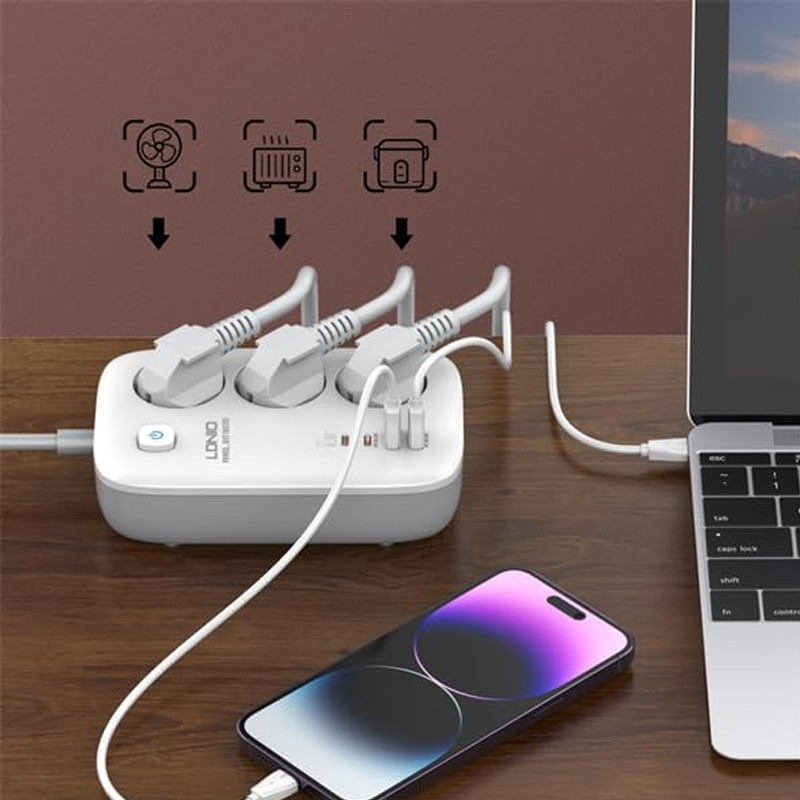دارای 4 پورت برای شارژ گوشی | دو پورت USB | دو پورت Type-C | پشتیبانی از قابلیت های PD و QC | دارای 3 عدد پریز