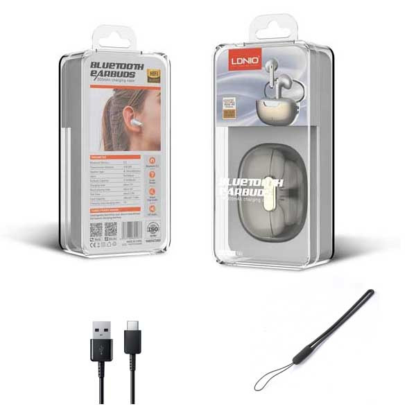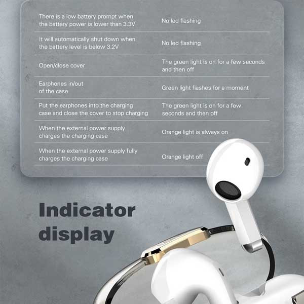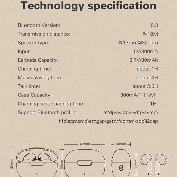 بلوتوث ورژن 5.3/ظرفیت باتری باکس 300 mAh/پخش HD صدا/درگاه شارژ کیس Type C/دارای دکمه لمسی/ظرفیت باتری هر یک از گوشی ها 30 mAh/مدت زمان پخش 4 ساعت/حداکثر مسافت جوابدهی بیسیم 10 m/زمان شارژ کامل 1 ساعت. در صورت شارژ کامل گوشیها و کیس تا 20 ساعت PlayTime