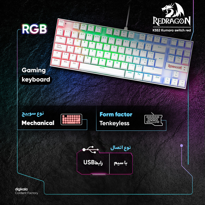 کیبورد گیمینگ ردراگون مدل K552 Kumara، سوییچ مکانیکال قرمز، Tenkeyless، نورپردازی RGB، قابلیت Anti-Ghosting
