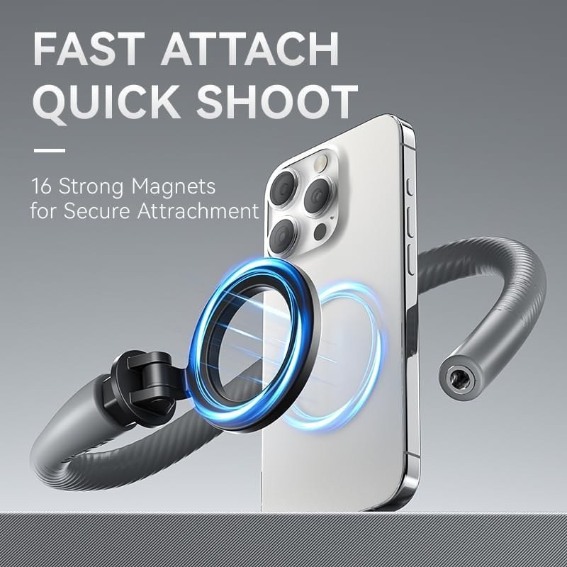 این پایه تلفن مینی انعطاف پذیر مغناطیسی دارای 16 آهنربای نئودیمیوم قوی برای دستیابی به جذب نزدیک و عکاسی فوری با یک دست است. در عین حال، به دلیل جذب پایدار، نیازی به ترس از افتادن آسان گوشی خود ندارید. علاوه بر این، طراحی حلقه مغناطیسی امکان چسباندن آسان با یک دست را فراهم می کند تا برداشتن و گذاشتن آن به پایان برسد.