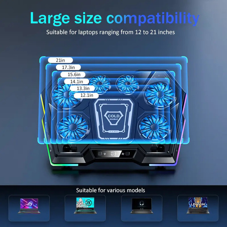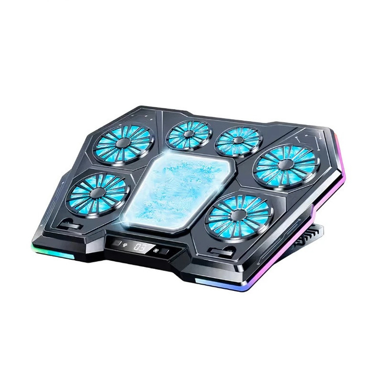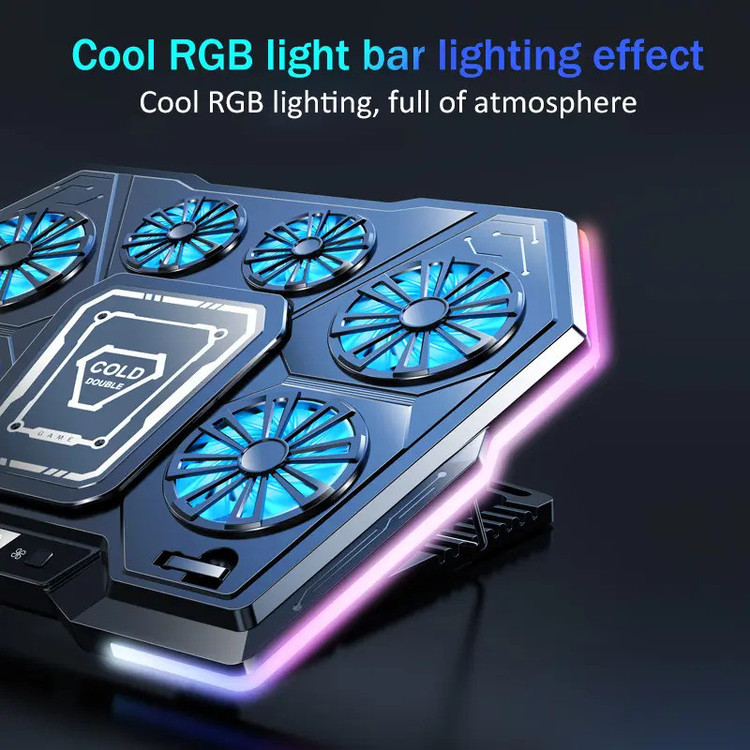 نوع فن: رادیاتوری و پنکهای، تعداد فن پنکهای: 6 عدد، قابلیت تنظیم ارتفاع پایه: دارد، نورپردازی RGB: دارد، دکمه تنظیم نورپردازی: دارد، دکمه تنظیم سرعت چرخش فن: دارد، گرمازدایی و سرما بخشی سریع: دارد، مناسب برای: انواع لپتاپ 12 تا 21 اینچ