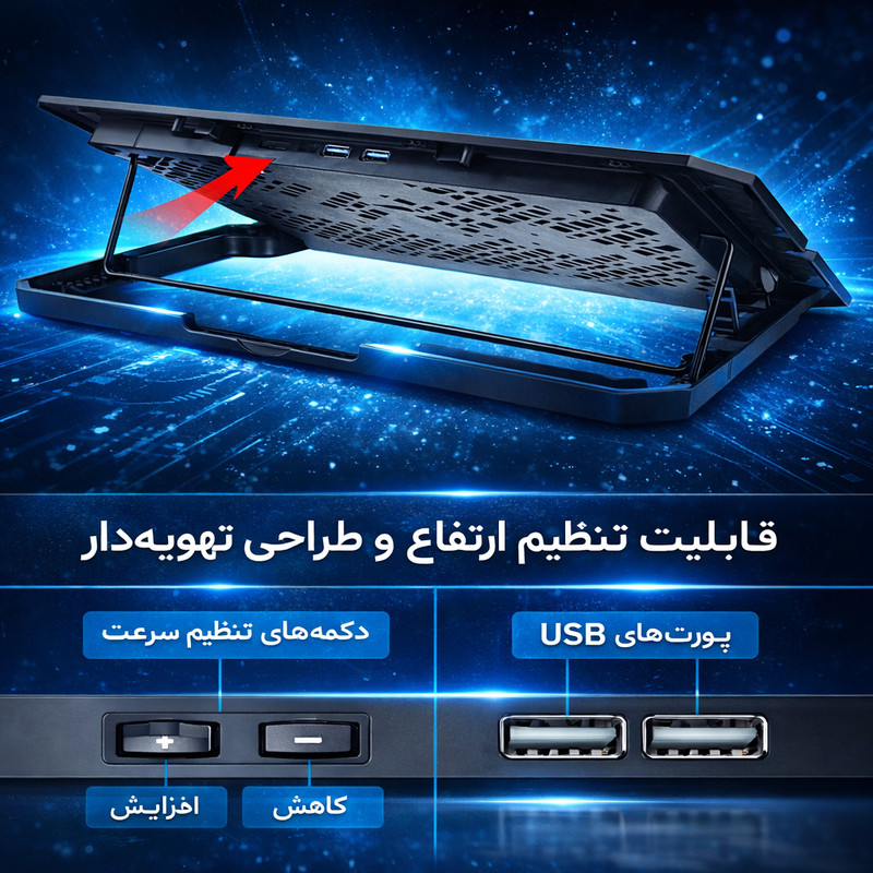 سطح فلزی مشبک این پایه به انتقال بهتر حرارت کمک میکند و قابلیت تنظیم زاویه دید در چند حالت مختلف، امکان انتخاب وضعیت مناسب برای تایپ یا بازی را فراهم میسازد و از خستگی گردن و مچ دست جلوگیری میکند.