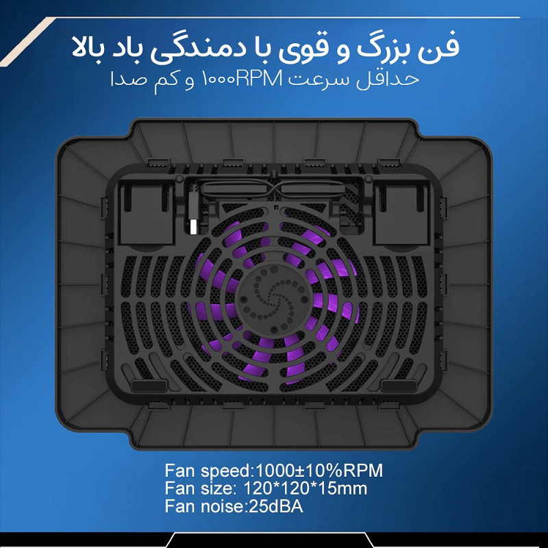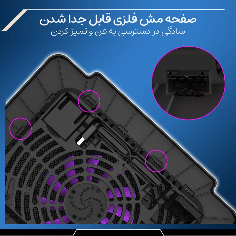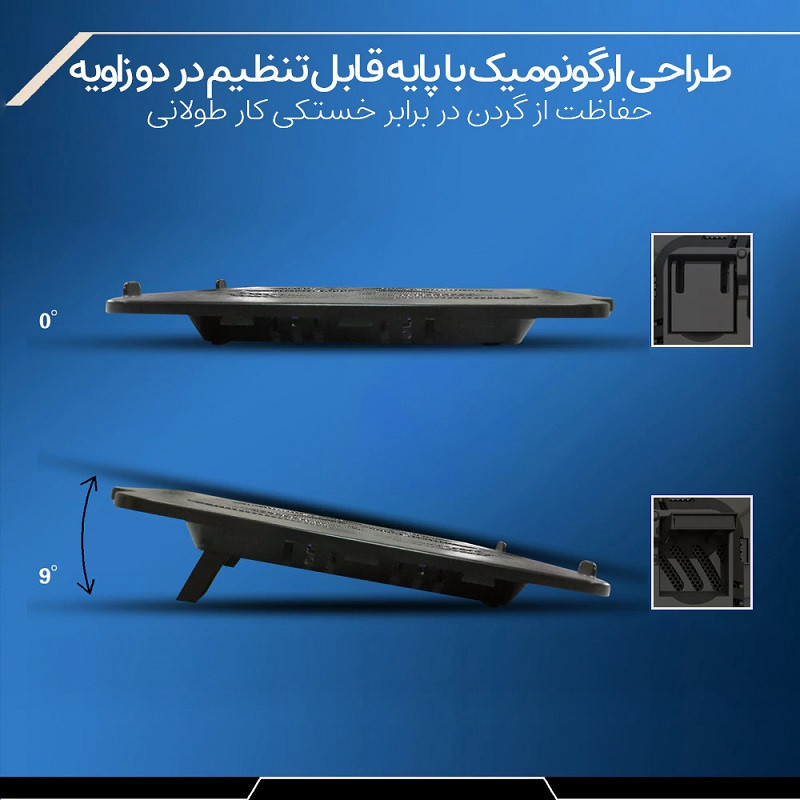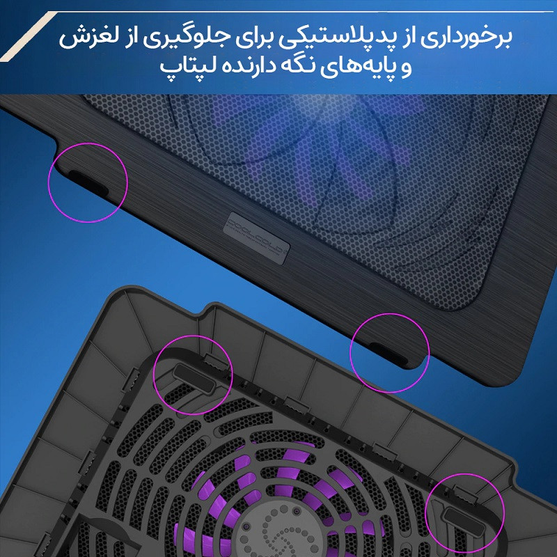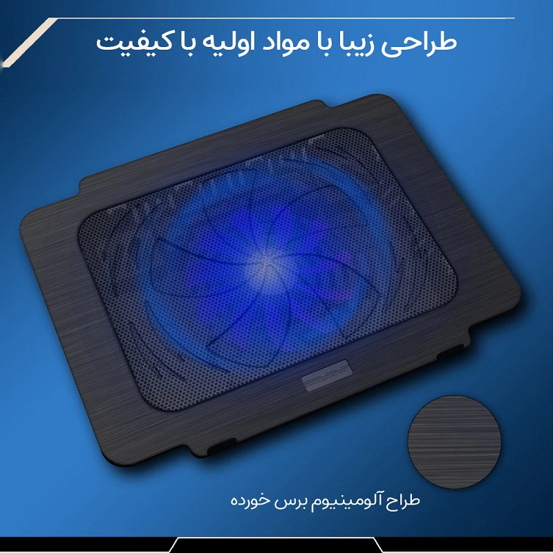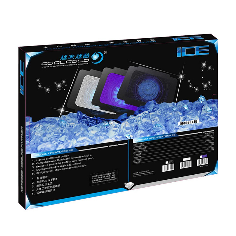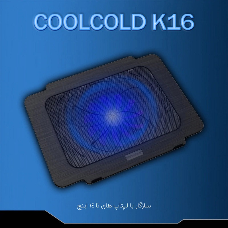 پایه خنک کننده لپتاپ کول کلد مدل K16 با طراحی باریک و قابل حمل با کیفیت ساخت بالا گزینه ای مناسب برای افرادی که نیاز به پایه خنک کننده ای با کارایی بالا و قابلیت حمل آسان دارند، میباشد. این پایه از جنس مش فلزی و پلاستیک ABS با طرح آلومینیوم برس خورده توانایی تحمل فشار 50 کیلوگرمی را دارد و در صورت سقوط از ارتفاع تا 2 متر نیز آسیبی به آن وارد نمیشود. بر روی این کول پد پایه های تنظیم تعبیه شده است تا کاربر بتواند با توجه به نیاز خود اقدام به تغییر ارتفاع و زاویه این پایه خنک کننده بکند. برای خنک کنندی لپ تاپ یک عدد فن بزرگ با ابعاد 120120x20 میلی متر که عملکردی بی صدا با قدرت دمندگی و خنک کنندگی بالا و سرعت چرخش 1000 ± 10% RPM دارد تعبیه شده است این پایه خنک کننده دارای نورپردازی LED میباشد که در کنار کارایی زیبایی این محصول را نیز دو چندان کرده است همچنین صفحه مش این پایه خنک کننده امکان جداسازی دارد در نتیجه امکان دسترسی به فن جهت تمیز کردن گرد و غبار آسان و سریع میباشد.