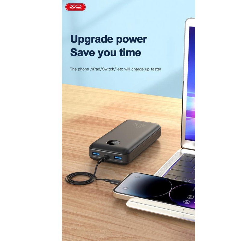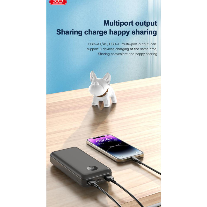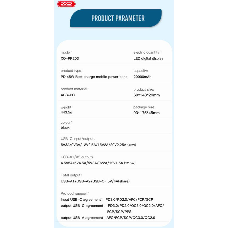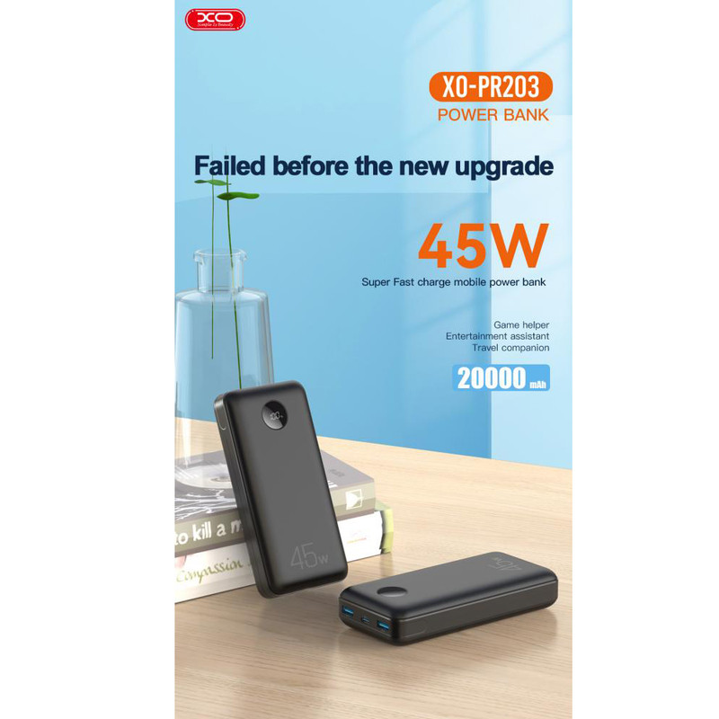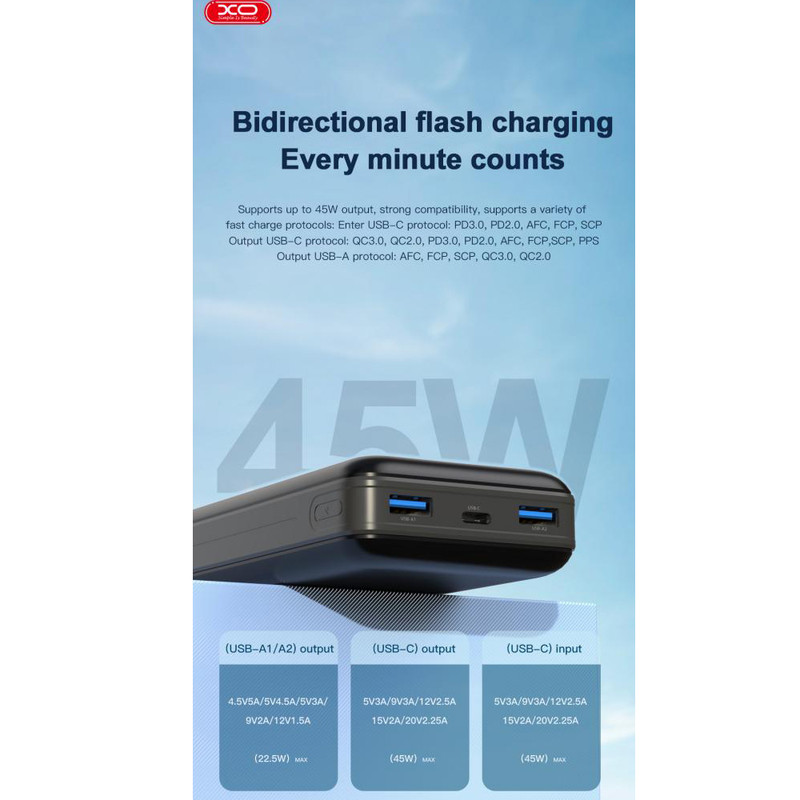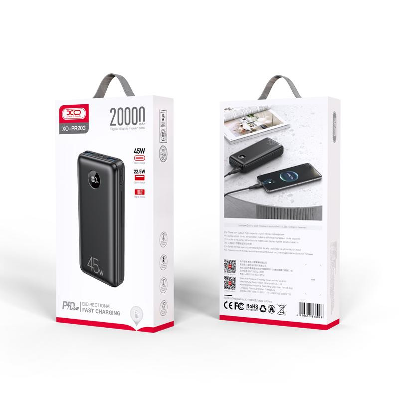 در بخش کناری بدنه کلید on/off طراحی شده تا امکان روشن یا خاموش کردن آسان آن برای شما وجود داشته باشد. یک نمایشگر دیجیتال LED هم در بخش بالایی آن وجود دارد که میزان شارژ باتری را به اطلاع میرساند.روی بدنه پاوربانک ایکس او دو پورت خروجی USB و یک درگاه Type-C دو طرفه ( ورودی و خروجی) وجود دارد. حداکثر خروجی آن 45 وات بوده که متعلق به درگاه تایپسی است.XO PR203 20000 mAh دارای تراشه ایمنی بوده و از باتری دستگاه شما در برابر آسیبهایی مانند شارژ بیش از حد، داغ شدن، ولتاژ بیش از و اتصال کوتاه حد محافظت میکند.ظرفیت اسمی این محصول برند XO برابر با 20000 میلیآمپرساعتی دارد اما باید این نکته را هم در نظر داشت که ظرفیت واقعی عددی کمتر از ظرفیت اسمی است. این شارژر هم ظرفیت واقعی 11800 میلیآمپرساعت را در اختیارتان قرار میدهد.