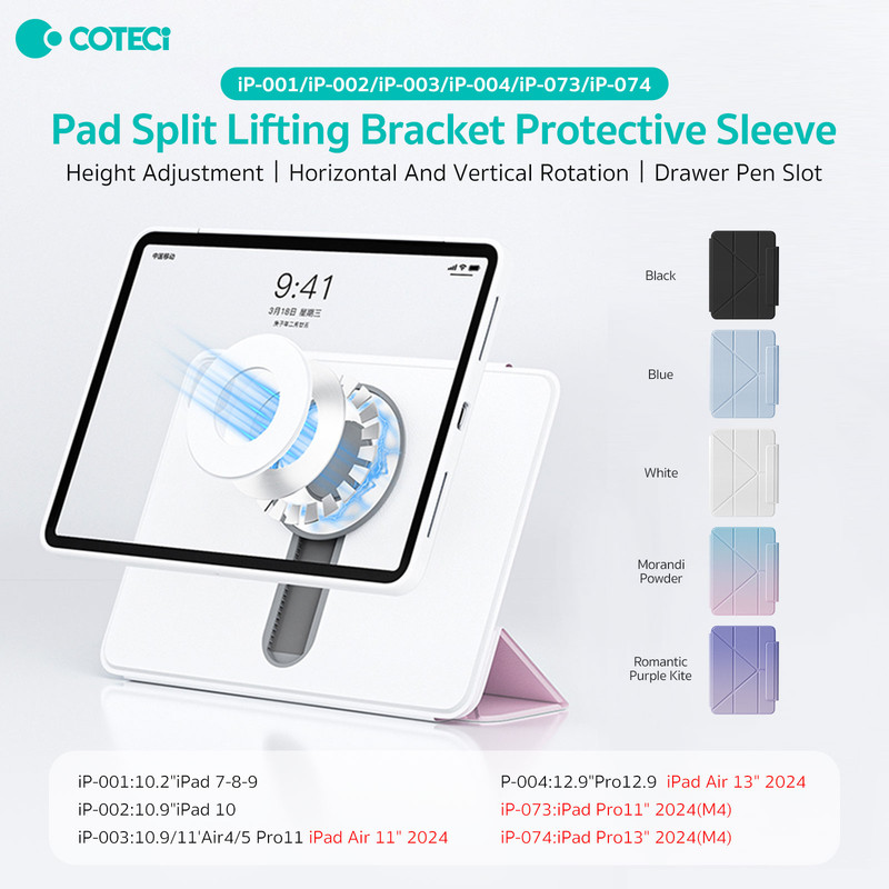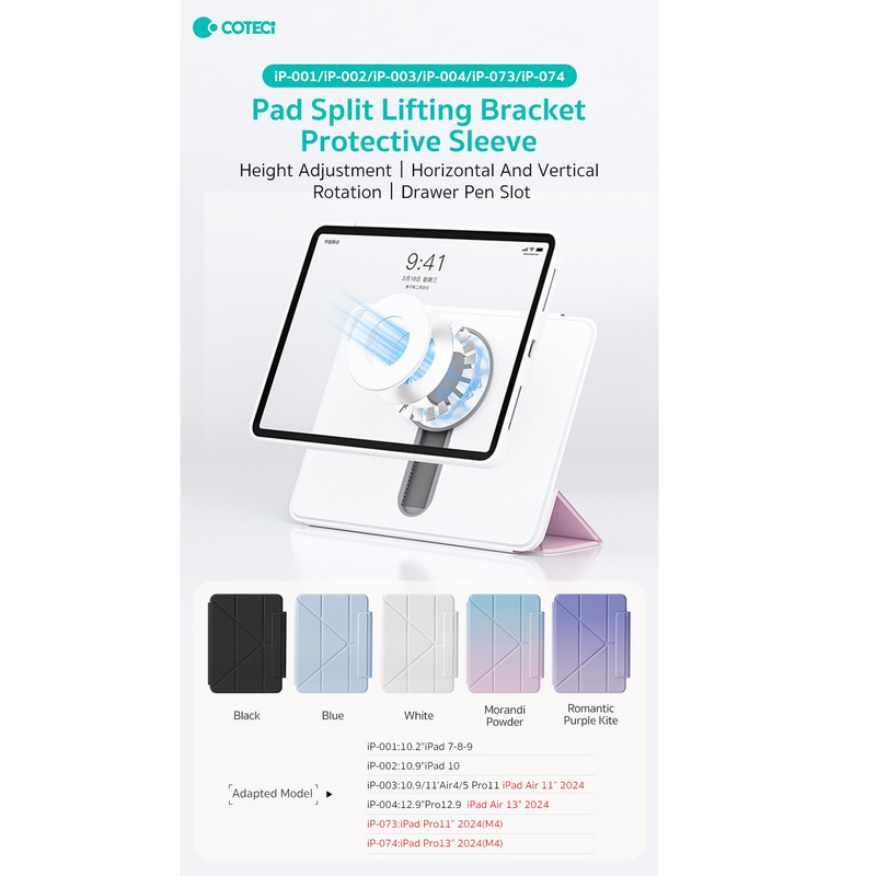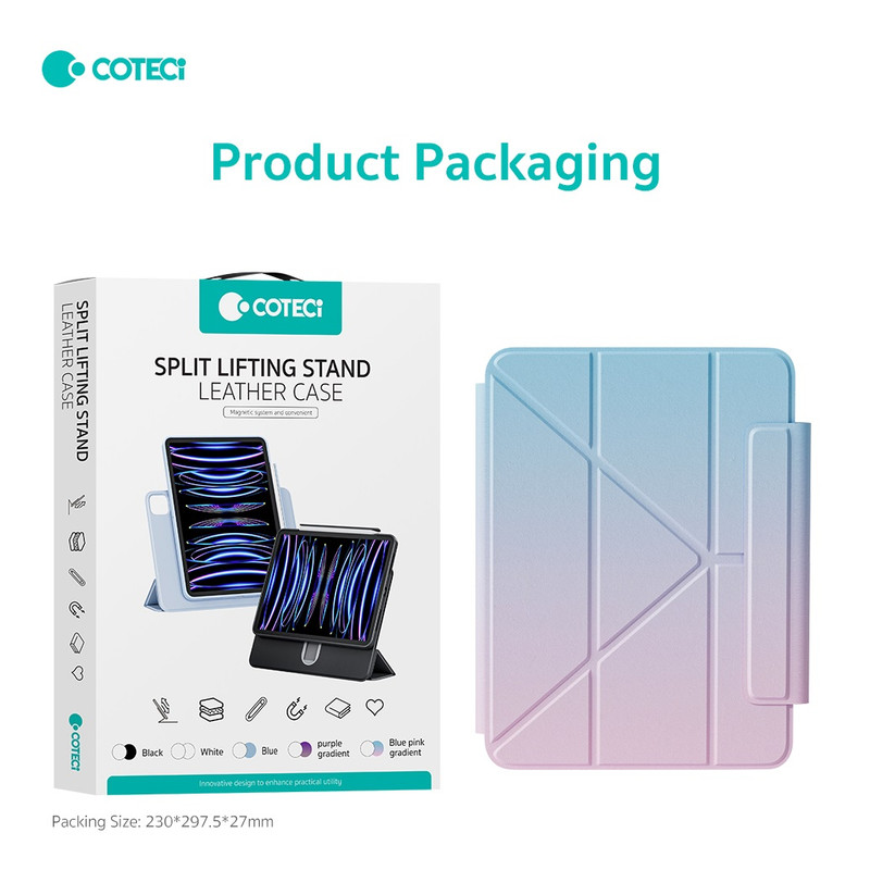یکی از ویژگیهای بارز این کیف، پایه بلند شو (Pad Split Lifting Bracket) آن است که قابلیت تنظیم ارتفاع را فراهم میکند. با این ویژگی میتوانید تبلت خود را در زوایای دلخواه قرار دهید و تجربه تماشای بهتری داشته باشید. این کیف به شما امکان میدهد تا تبلت را به راحتی در حالت افقی و عمودی بچرخانید و در هر موقعیتی از آن استفاده کنید.