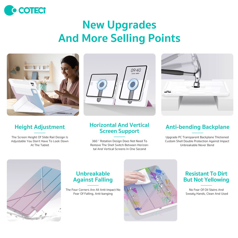 کیف کوتتسی با استفاده از آهنربای قوی خود، تبلت شما را به طور محکم نگه میدارد و خطر افتادن دستگاه را به حداقل میرساند. همچنین، قابلیت چرخش 360 درجهای به شما آزادی عمل بیشتری میدهد تا در هر زاویهای تبلت خود را قرار دهید.
