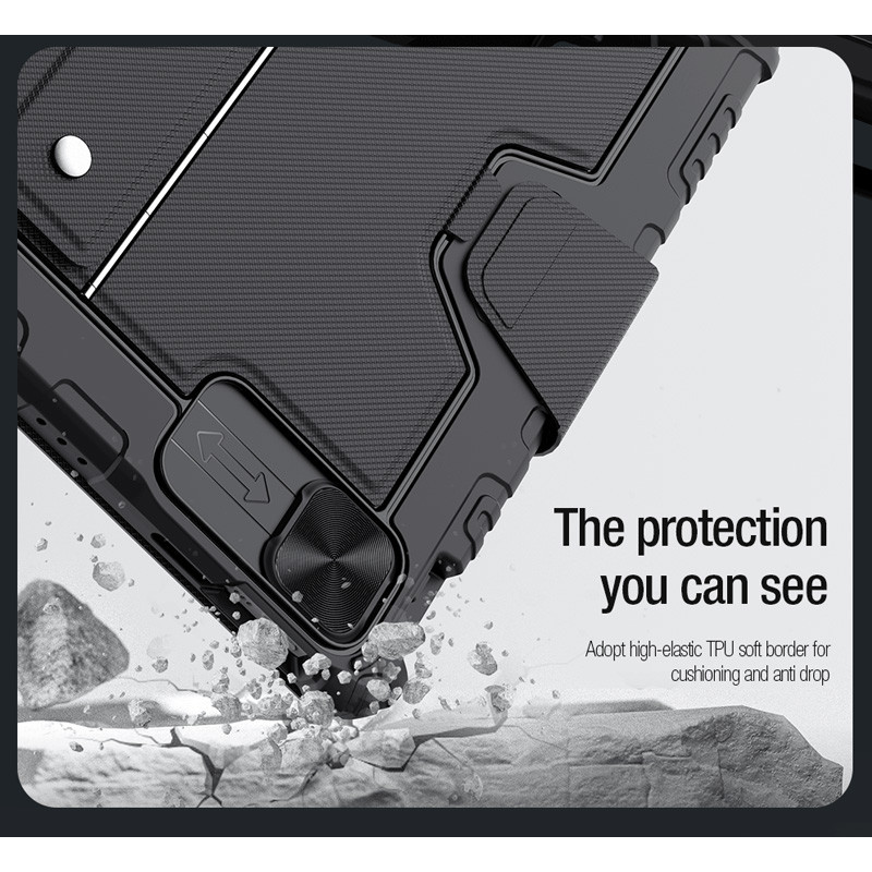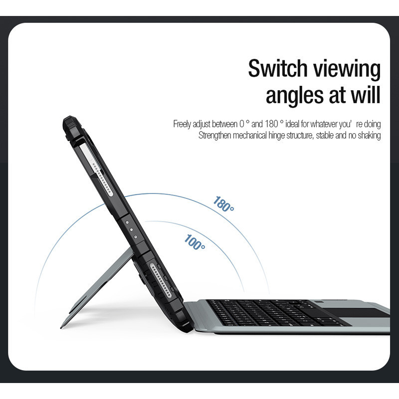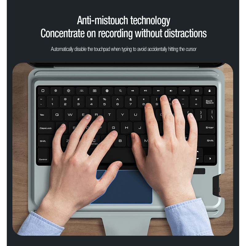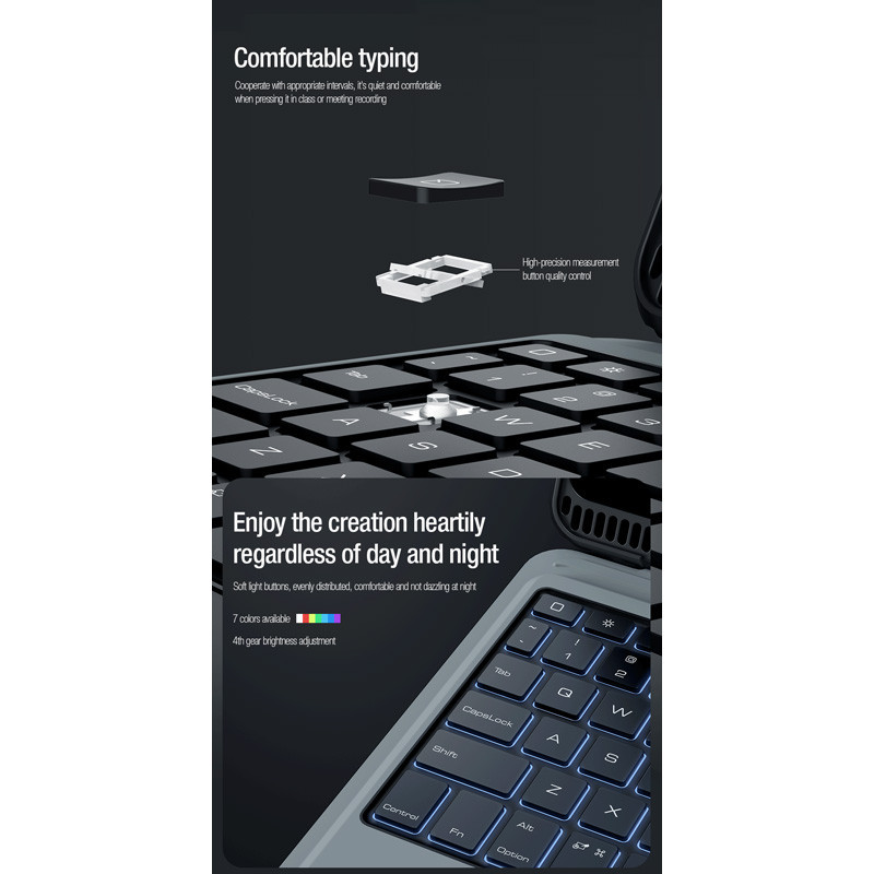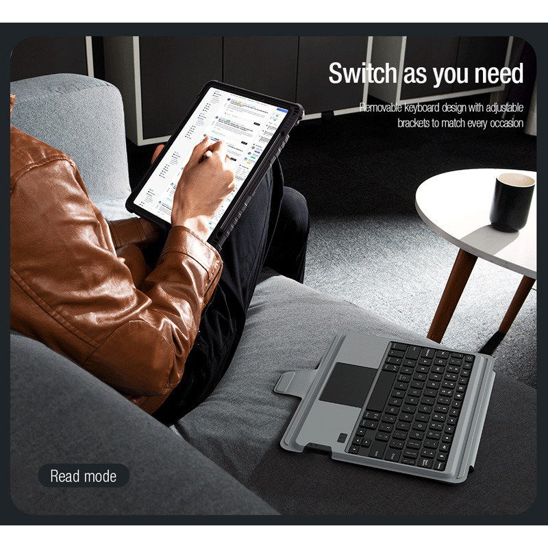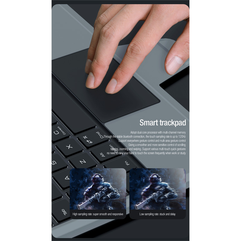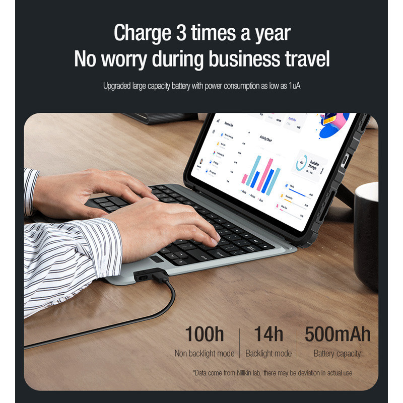 کیف کلاسوری نیلکین مدل Bumper Combo Backlit Keyboard جدیدترین نسخه Combo Keyboard اواخر سال 2023 می باشد که در مدل Backlit علاوه بر ویژگی های نسخه قبلی ویژگی نور پس زمینه در کیبورد با 7 رنگ متفاوت به آن اضافه شده که دیگر در فضای کم نور و یا شب به راحتی میتوانید از کیبورد استفاده کنید و دیگر دغدغه نور هنگام تایپ کردن را نداشته باشید.جنس این کاور ازTPUوPCساخته شده که دارای مقاومت بالایی می باشد.این کیف کلاسوری دارای محافظ دوربین بوده که به صورت کشویی عمل میکند.یکی از قابلیت های مفید در قاب تبلت ها داشتن استند است؛چون این دستگاه ها ابعاد بزرگی دارند و نگهداری از آنها روی استند بسیار راحت تر و کم خطر تر است.از همین رو کیف کلاسوری دارای یک استند تاشو است که استحکام کافی برای نگهداشتن و استفاده از تبلت را خواهد داشت.شما می توانید حالت های مختلفی برای قرار گرفتن تبلت انتخاب کنید.این استند قابلیت تنظیم زاویه بین 110تا180درجه را دارد.این محصول نیلکین دارای یک کیبورد قابل جدا شدن می باش .شما در صورت نیاز می توانید از این کیبورد استفاده کرده و یا آن را جدا کنید.کلیدهای این کیبورد به گونهای(قطرهای)طراحی شده که قالب انگشتان شما باشد.این کلیدها بسیار بی صدا بوده و وزن پایینی دارد؛بعلاوه کار با آن شما را خسته نمیکند.کلیدهای کیبورد کیف کلاسوری بسیار حساس بوده و با کمترین فشار عمل خواهد کرد.بر روی این کیبورد یک پد لمسی وجود دارد که می توانید از آن به جای موس استفاده کنید.شما می توانید از طریق بلوتوث این کیبورد را به دستگاه خود متصل کنید.نرخ نمونه برداری لمسی پد لمسی آن120هرتز بوده که بسیار حساس بوده و از چند لمس همزمان پشتیبانی می کند.این کیبورد دارای یک باتری5000میلی آمپر ساعتی بوده که برای پر شدن آن نیاز به حدود 3 ساعت شارژ بوده و با پر بودن شارژ تا100 ساعت می توانید از آن استفاده کنید؛البته این عدد برای روزی2ساعت کار با کیبورد است که متناسب با استفاده شما متغییر خواهد شد.قابل ذکر است نسخه بلوتوث این کیبورد3.0می باشد و محدوده عملکرد آن حدود10متر است.در قسمت جلویی این قاب، جای برای قرار گرفتن قلم هوشمند اپل تعبیه شده که می توانید قلم خود را در این قسمت ها قرار دهید. با قرار گرفتن قلم در قسمت جلویی تعبیه شده در تبلت، می توانید قلم خود را به صورت وایرلس شارژ کنید.