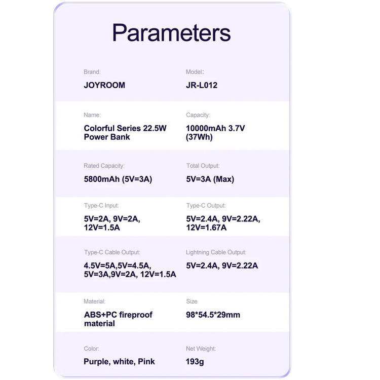 پاوربانک جوی روم مدل 22.5W JRL012 ظرفیت 10000 میلی آمپر ساعت