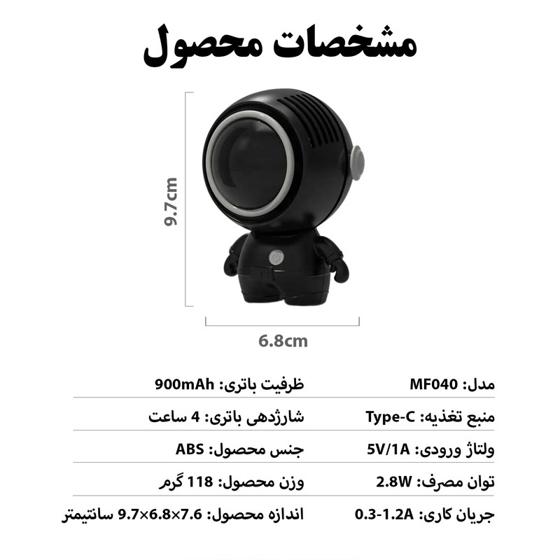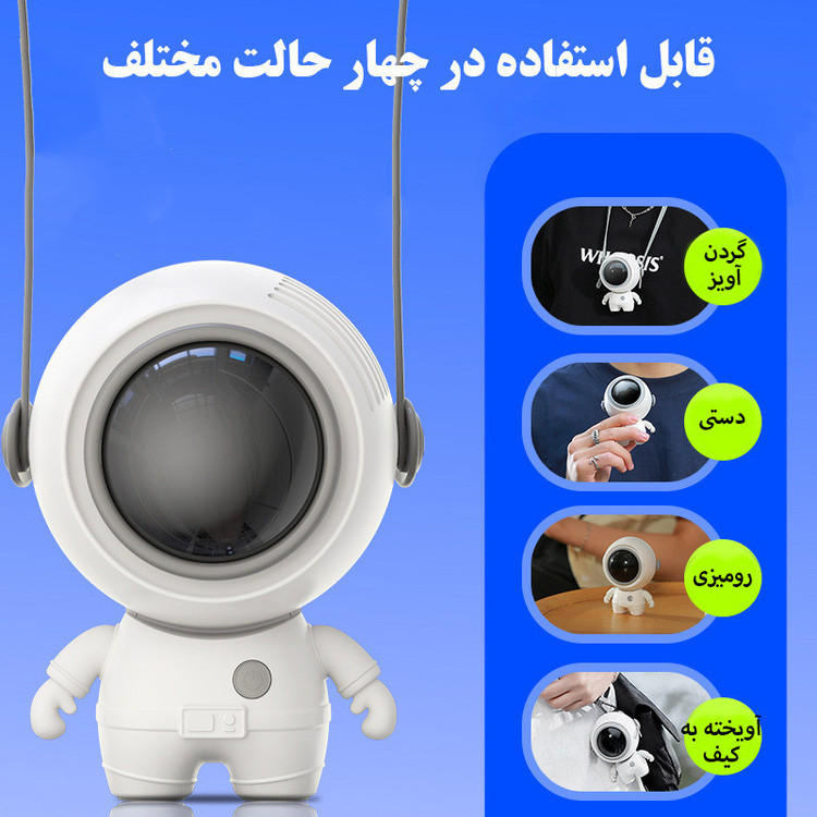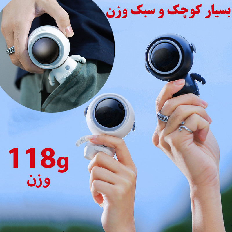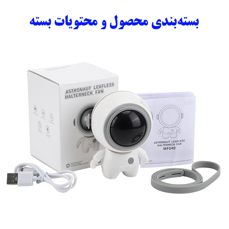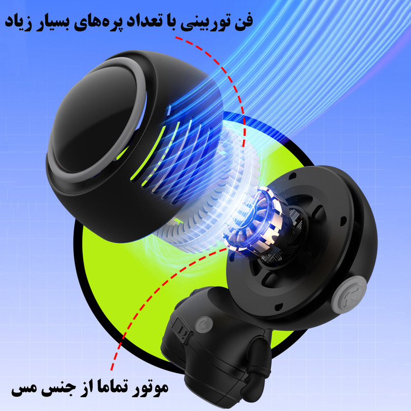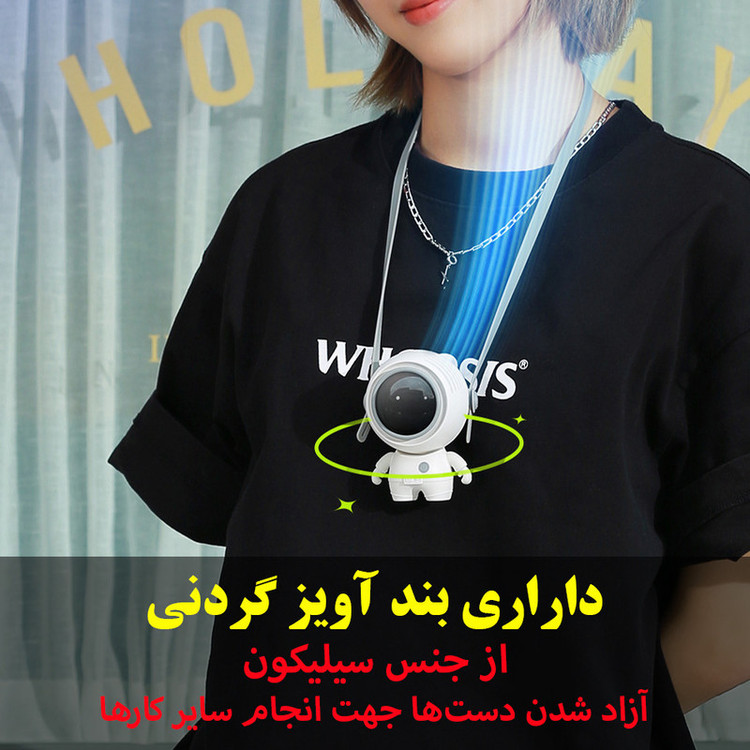 قابلیت تنظیم زاویه باد - دارای باتری 900 میلیآمپر - دارای 3 سرعت باد - فن توربینی با 32 پره - موتور براشلس بسیار کم مصرف - دارای بند آویزی گردنی
