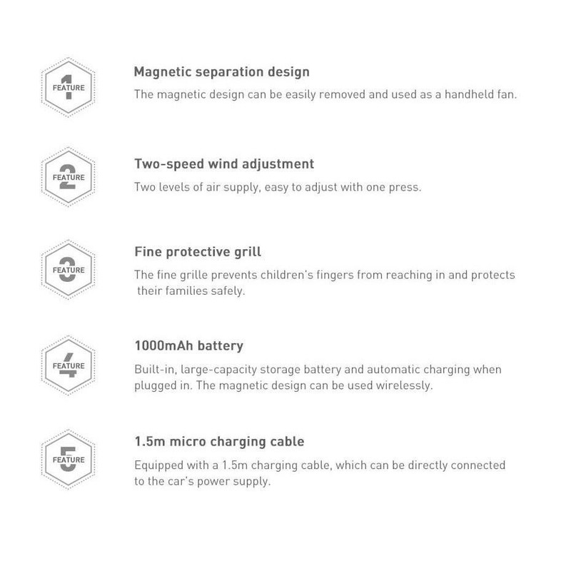 ابعاد: 12.9×12.9×14 سانتی متر / امکان تنظیم 360 درجه ای خاصیت مگنتی با امکان شارژ بی سیم / جنس بدنه: ABS + PC / قابلیت تنظیم میزان باددهی در 2 حالت / بهرهمندی از باتری 1000mAh