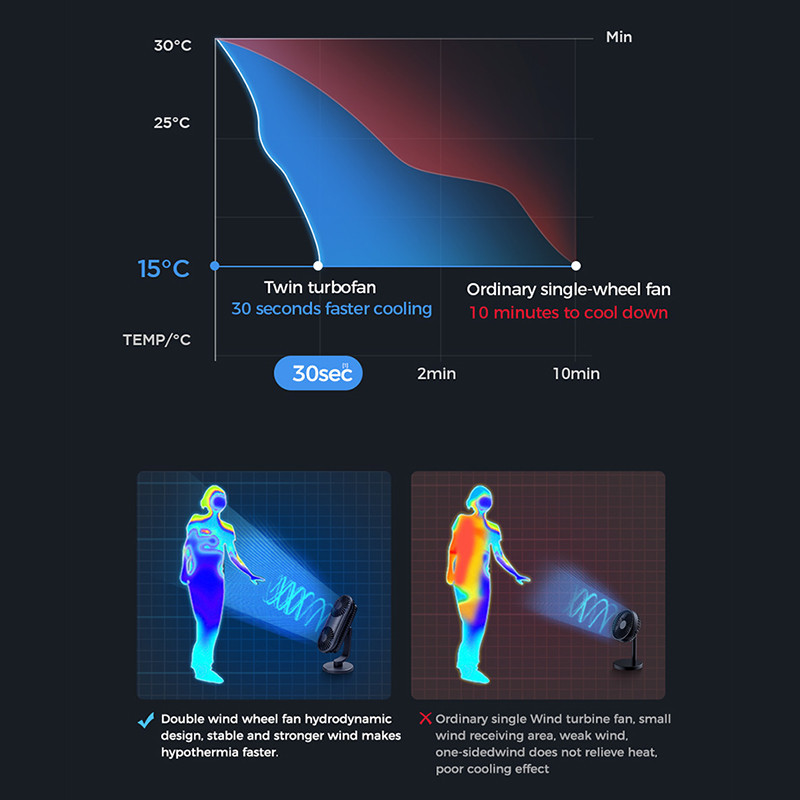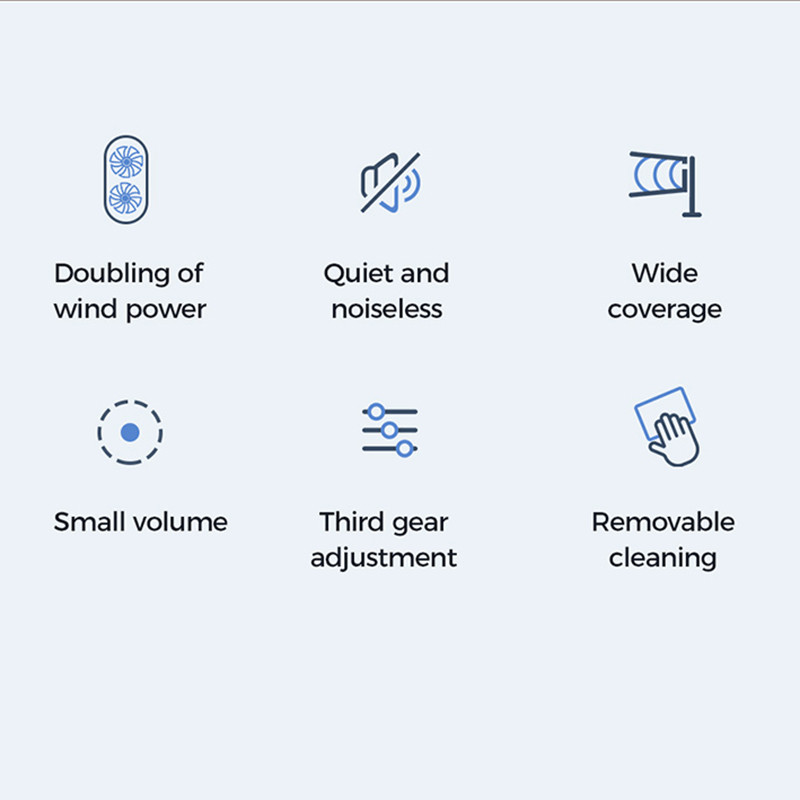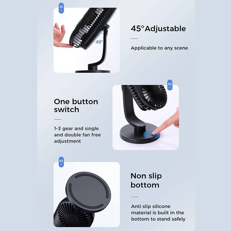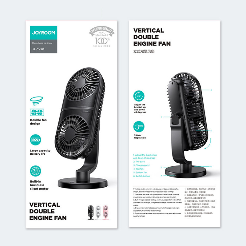 پنکه رومیزی JoyRoom JR-CY312 دارای دو موتور (دو فن) جداگانه برای پرتاب باد بوده که به صورت عمودی روی هم قرار گرفته است؛ هر موتور پنکه جویروم CY312 دارای 7 پره می باشد. شما می توانید این پنکه را به صورت عمودی روی میز و ... استفاده کنید.