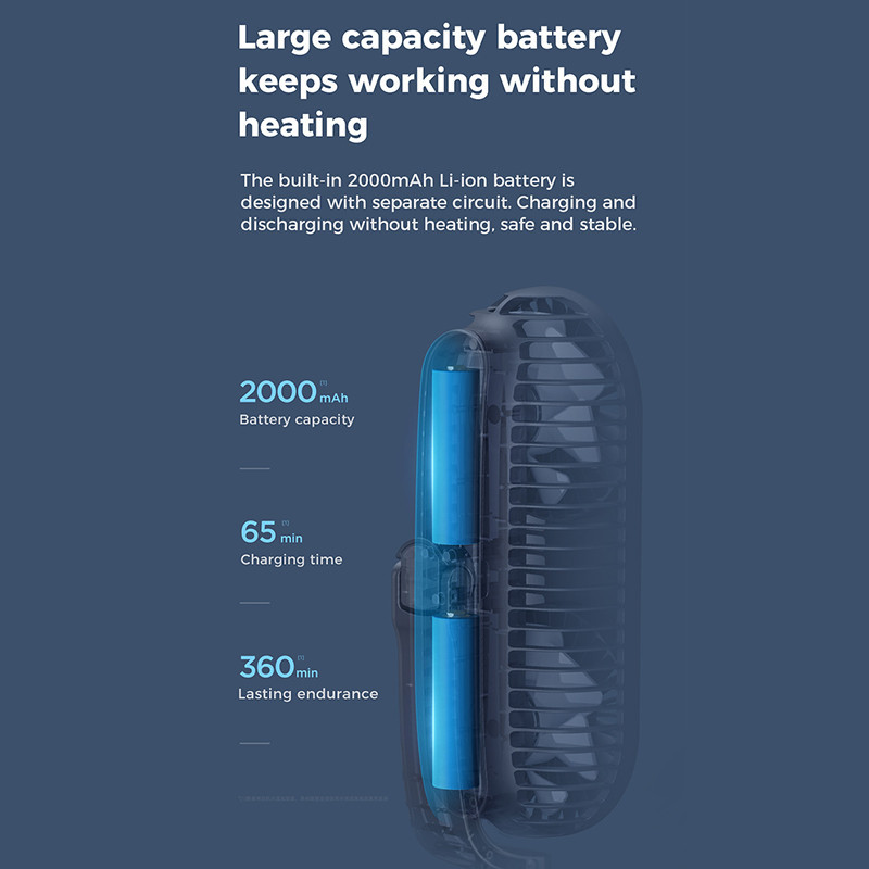 پنکه رومیزی جویروم JR-CY312 دارای باتری 2000 میلی آمپری بوده و برای شارژ کامل آن حدود 1 تا 2 ساعت زمان نیاز بوده و با پر شدن شارژ می تواند تا حدود 360 دقیقه (متناسب با سرعت باد) کار کند.
