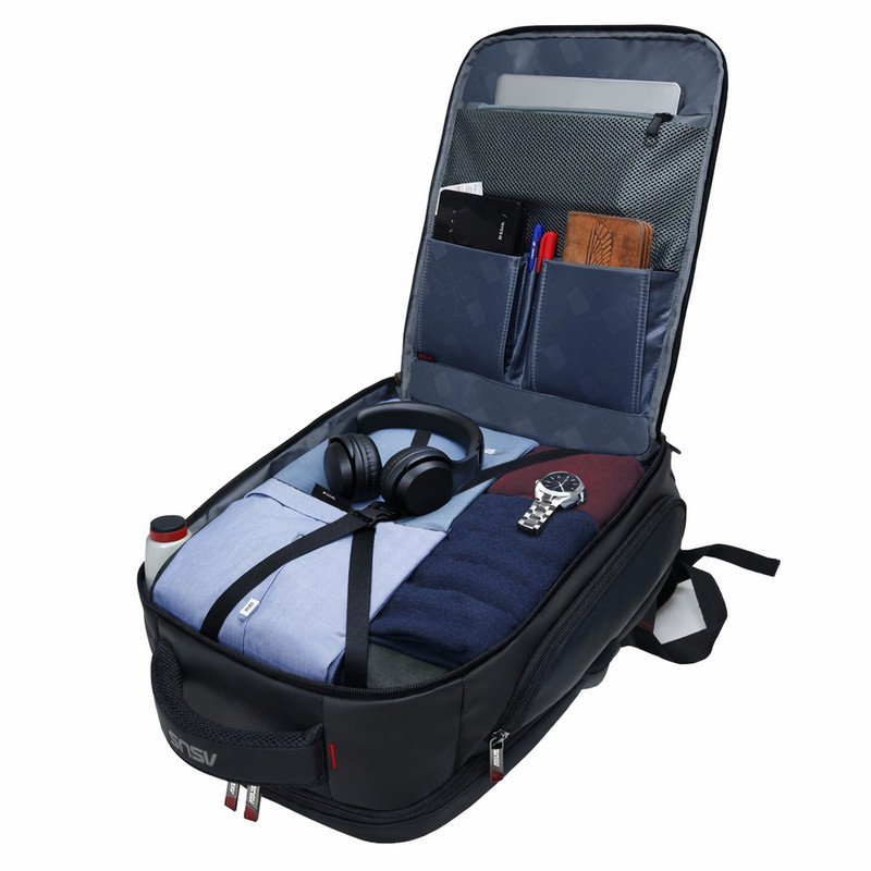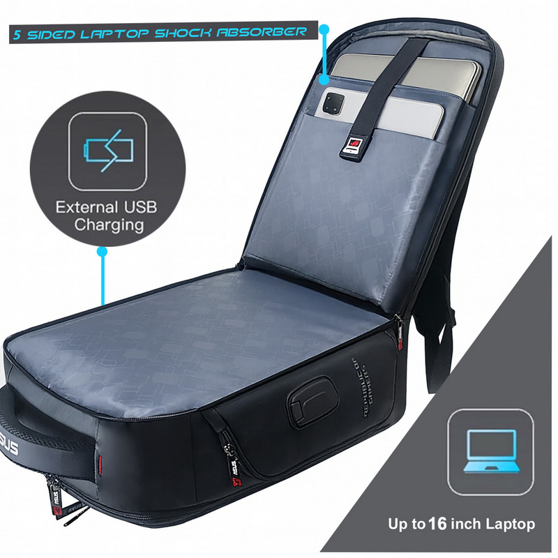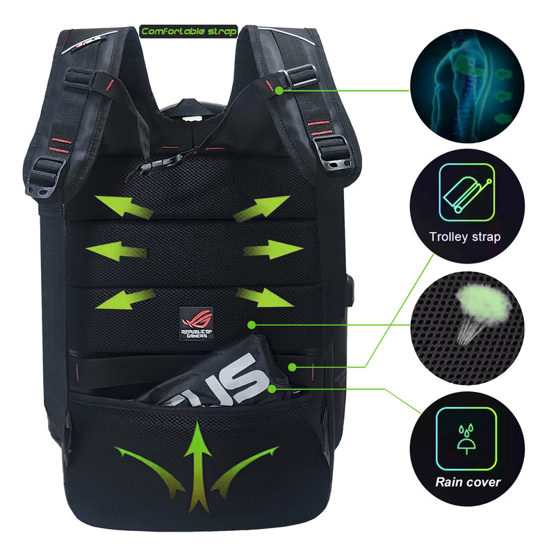 دارای پورت USB , مقاومت در برابر آب , ضربهگیر حبابدار در محفظه لپتاپ , قابلیت نصب روی دسته چمدان , دارای کاور ضد آب