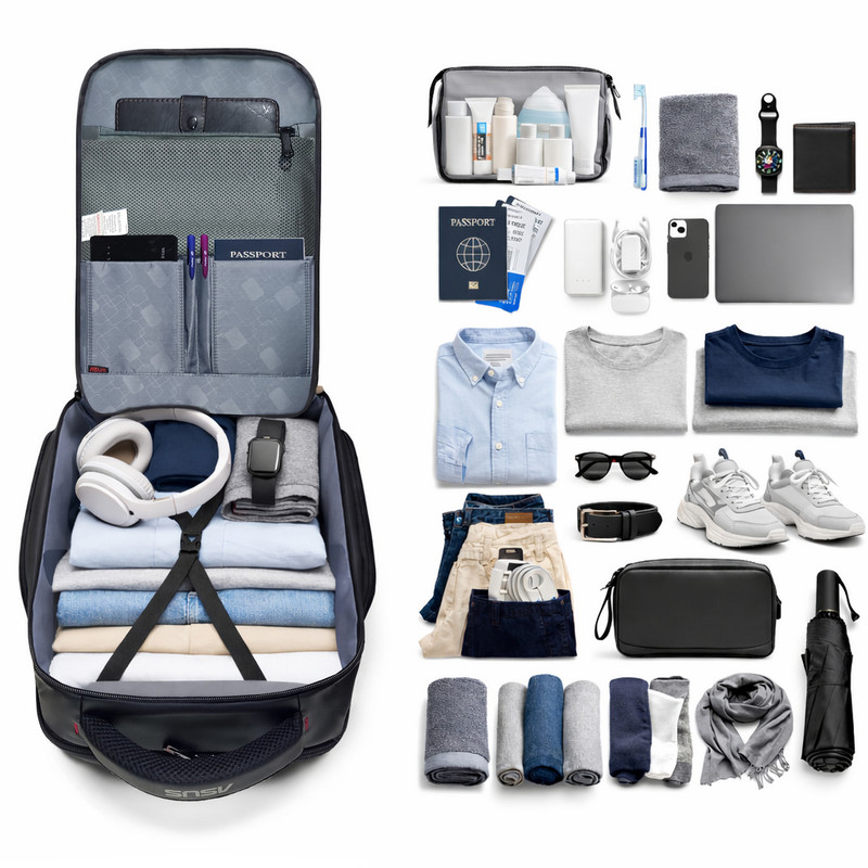 جیب بیرونی , جیب خودکار , جیب داخلی , محفظه نگهداری اسناد , جیب کارت اعتباری , محفظه کابل و شارژر , جای قمقمه
