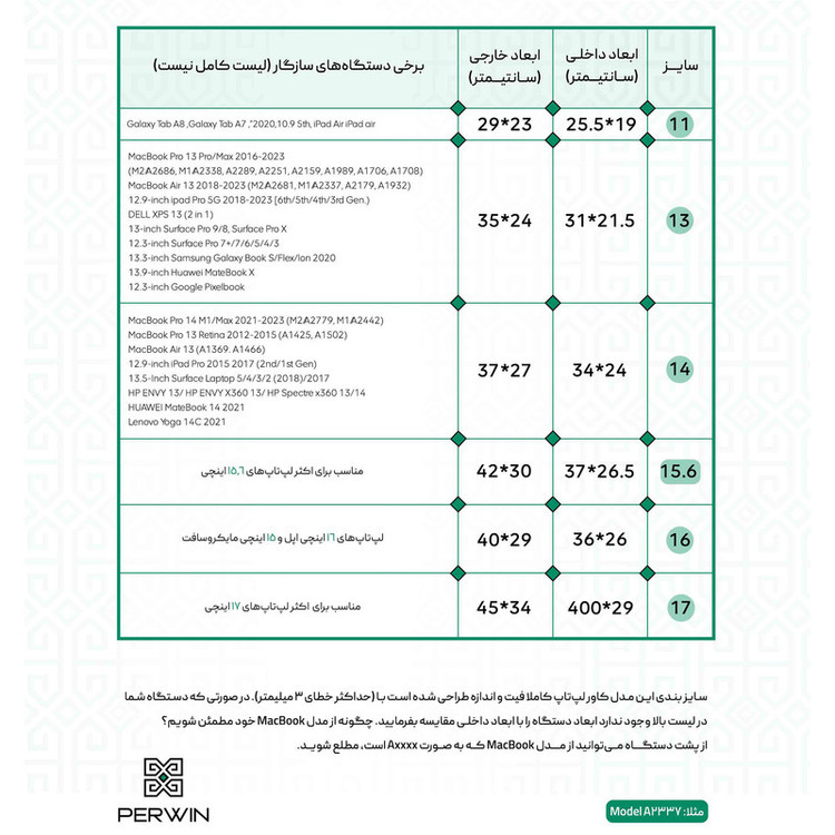 لطفا قبل از انتخاب و خرید، بهدلیل تفاوت ابعاد فیزیکی لپتاپ برندهای مختلف، از جدول راهنمای سایز، کاور مناسب با دستگاه خود انتخاب کنید.