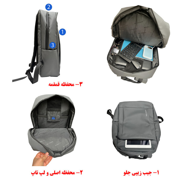 -ضد آب - بند متصل کردن دسته چمدان -2 عدد جای بطری مجزا -محفظه مخصوص لپ تاپ و تبلت دارای ضربه گیر -ساخت کشور چین
