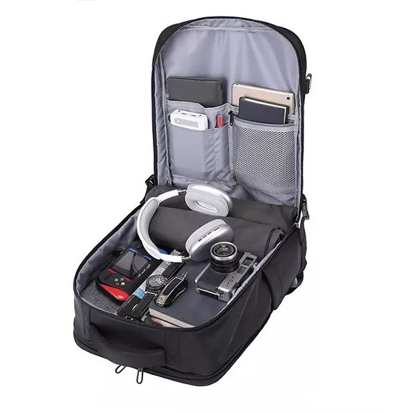 تعداد جیب:دو محفظه بزرگ با جیب های متعدد تعداد بند:2بند مقاوم در برابر سایش طراحی کمربند نایلونی برای قرار دادن روی دسته چمدان ضد تعریق دارای لایه اسفنجی قابل تنفس دارای درگاه یواس بی برای شارژ جیب مخفی در قسمت پشت فرم بدنه نرم ضدآب