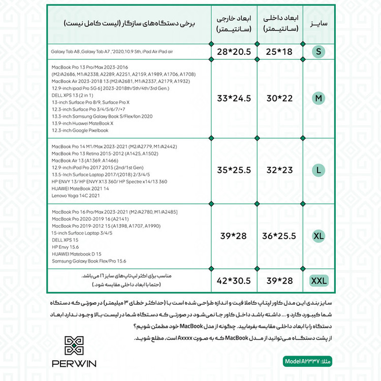 لطفا قبل از انتخاب و خرید، بهدلیل تفاوت ابعاد فیزیکی لپتاپ برندهای مختلف، از جدول راهنمای سایز، کاور مناسب با دستگاه خود انتخاب کنید.