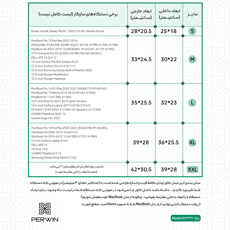 لطفا قبل از انتخاب و خرید، بهدلیل تفاوت ابعاد فیزیکی لپتاپ برندهای مختلف، از جدول راهنمای سایز، کاور مناسب با لپتاپ خود انتخاب کنید.