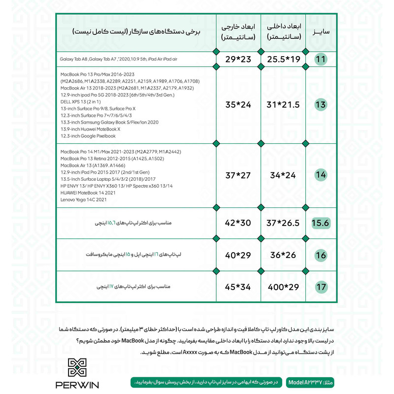 لطفا قبل از انتخاب و خرید، بهدلیل تفاوت ابعاد فیزیکی لپتاپ برندهای مختلف، از جدول راهنمای سایز، کاور مناسب با لپتاپ خود انتخاب کنید.