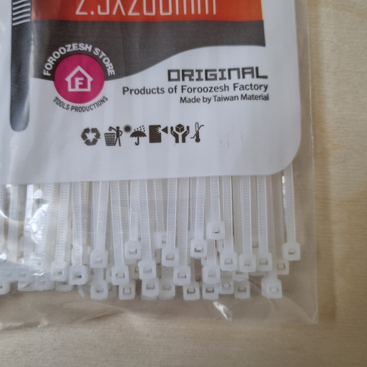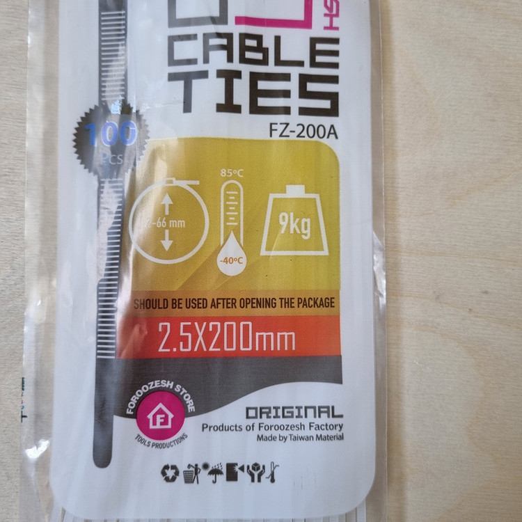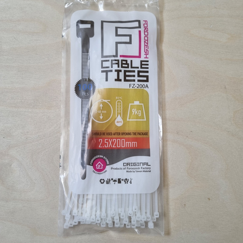 قابلیت تحمل وزن تا 9 کیلو گرم قابل استفاده در دمای بین منفی 40 تا 85 درجه سانتیگراد ابعاد خود بست 2.5 × 200 میلی متر مجموعه 100 عددی برند فروزش