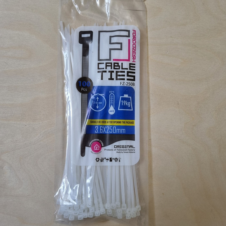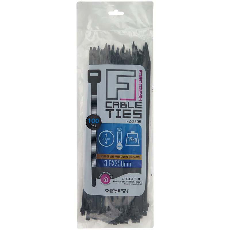 قابلیت تحمل وزن تا 19 کیلو گرم قابل استفاده در دمای بین منفی 40 تا 85 درجه سانتیگراد ابعاد خود بست 3.6 × 250 میلی متر مجموعه 100 عددی برند فروزش