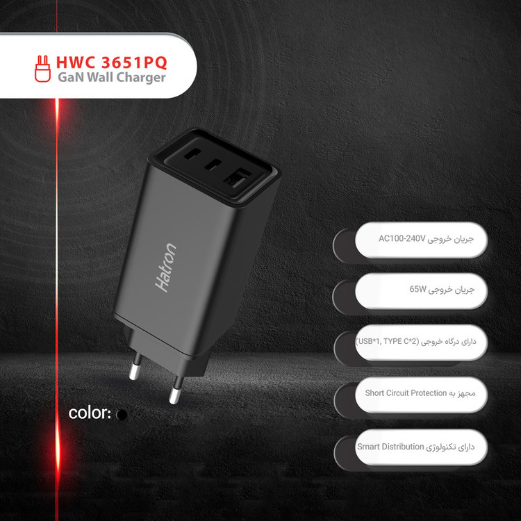 شارژر دیواری 65 وات هترون مدل HWC 3651 PQ GaN
