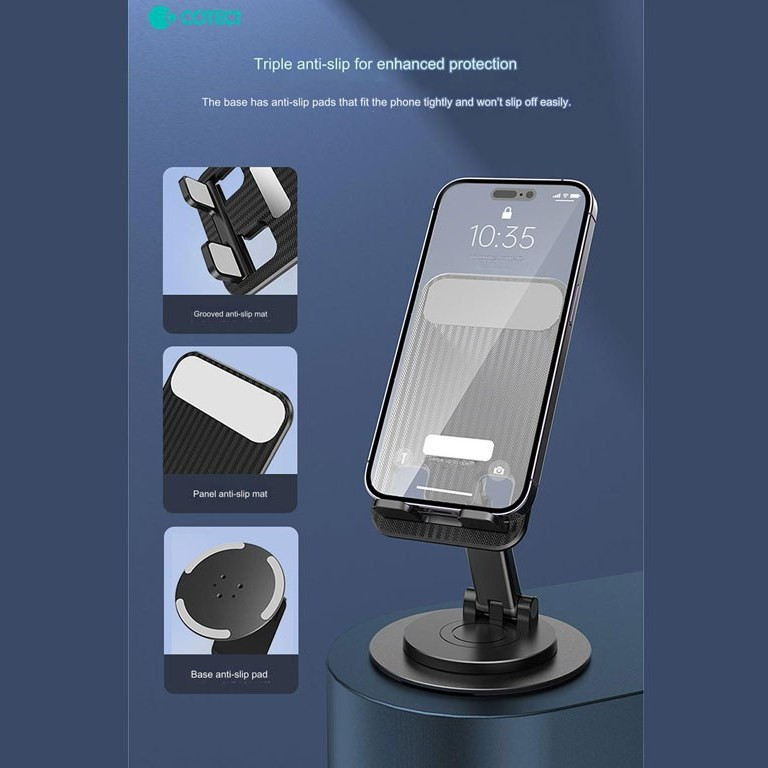 پایه این محصول قابلیت تنظیم ارتفاع داشته و میتوانید آن را بسته به نیاز خود تنظیم کنید. شما می توانید بخش گردنی این هولدر را تا 180 درجه به بالا و پایین تنظیم کنید. همچنین قسمت پایه هولدر و پایه نگهدارنده کوتتسی Coteetci قابلیت چرخش 360 درجهای دارد. علاوه بر این یک پیچ دیگرنیز روی این محصول قرار گرفته که میتوانید به کمک آن خود گوشی را در زوایای 180 درجه بچرخانید.
