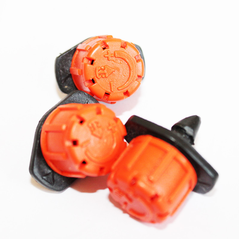 قطره چکان تنظیم شونده 8 نازله میزان آبدهی: تنظیم شونده آبیاری به صورت چتری و قابل تنظیم بین شعاع 5 تا 50 سانتیمتر دارای نشان حک شده RR (روان ریز) بر روی قطره چکان